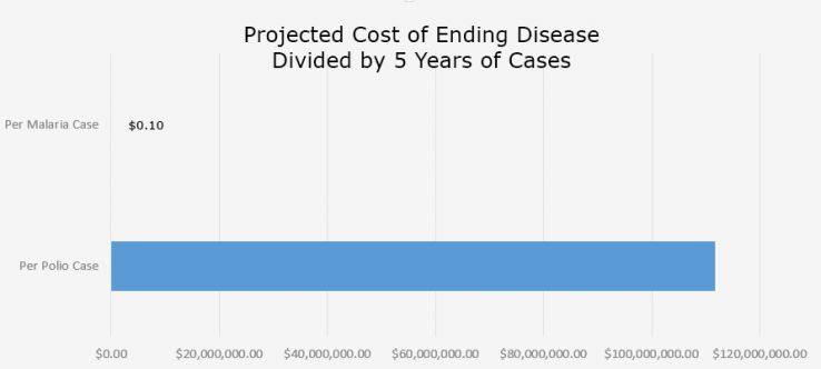 In this light, it seems almost insane to spend that much money preventing just a couple more polio cases relative to the huge gains we could make on malaria. Of course, the statistics don't tell the full story. Polio is in the end-stages of eradication where the cost-per-case is much higher, and as malaria is attacked, it too will see cost-per-case increase. But the point remains the same: by giving the polio numbers some sort of context, some sort of forced perspective, we make the data far more intriguing and appealing.